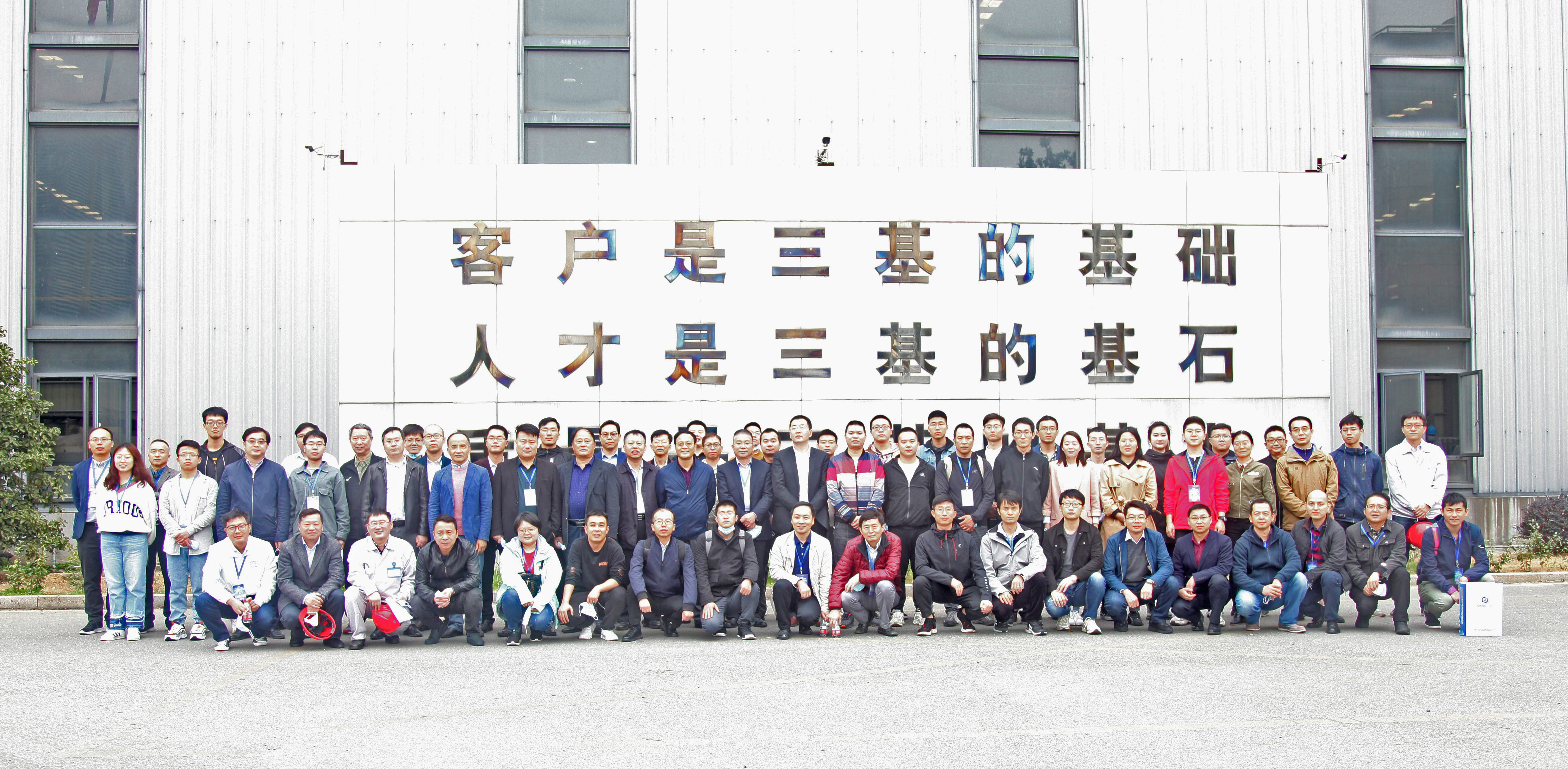參觀(guān)人員集體在三基鑄裝經(jīng)營(yíng)理念墻前集體合影