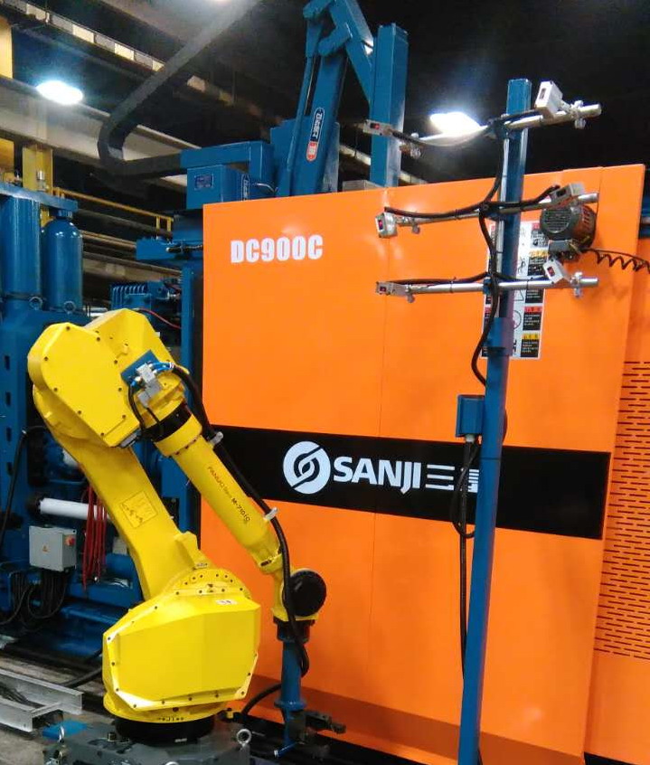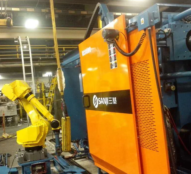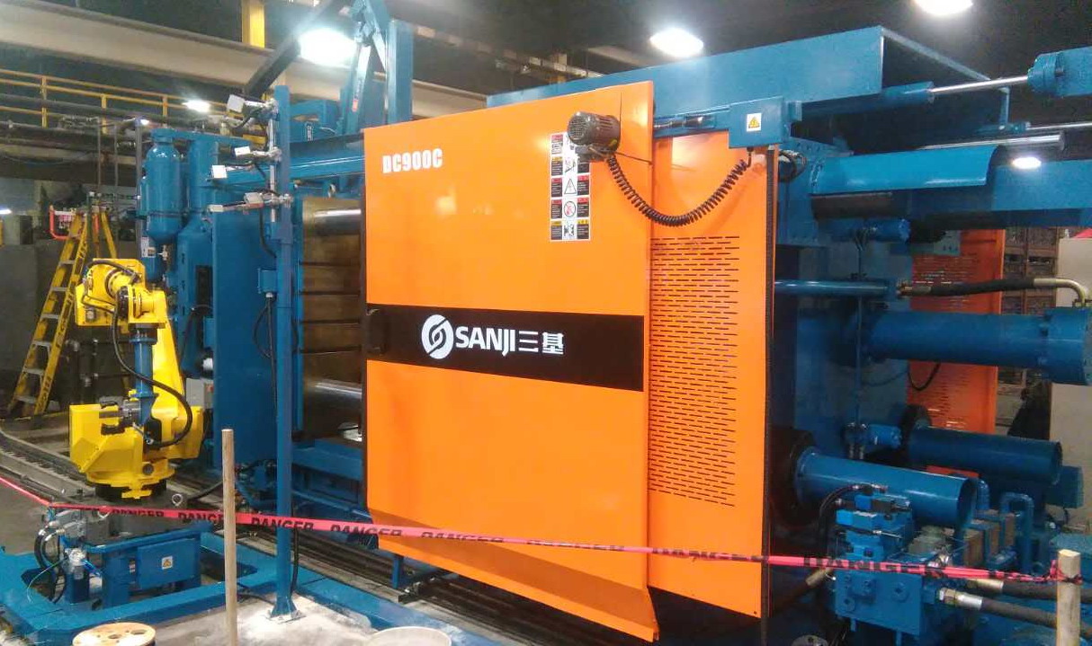 蘇州三基依照美國的UL認(rèn)證安全要求設(shè)計了歐美版臥式冷室壓鑄機(jī)系列產(chǎn)品,該產(chǎn)品在電氣控制系統(tǒng)、液壓油路、合模系統(tǒng)、機(jī)座系統(tǒng)等方面進(jìn)行了全新設(shè)計,合模機(jī)構(gòu)的模板、曲肘系統(tǒng)全部采用鑄鋼件,大大提高了壓鑄機(jī)的整體剛性。其中900噸臥式冷室壓鑄機(jī)已于2016年10月份成功銷往美國市場,該設(shè)備采用AB控制系統(tǒng)和美國VTW實時控制系統(tǒng),集成了給湯機(jī)、噴霧機(jī)、取件機(jī)器人、切邊機(jī)等自動化設(shè)備,組建了一個自動化壓鑄島,用于汽車零部件的自動化生產(chǎn)。設(shè)備目前正處于安裝調(diào)試階段,將在2017年2月份正是達(dá)產(chǎn)。