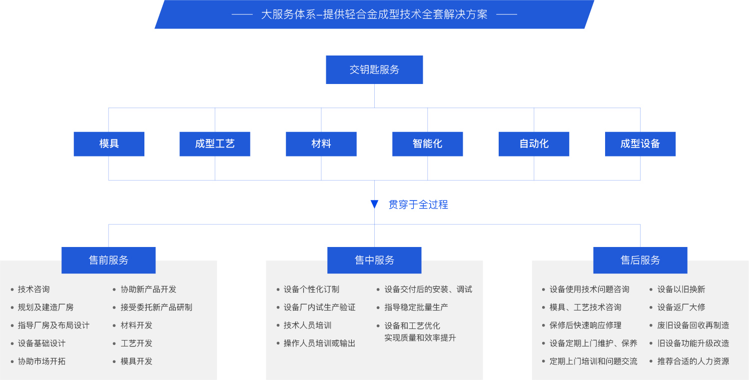 公司秉承“大服務(wù)”理念,為客戶提供輕合金精密成型全套解決方案,解決方案涵蓋成型設(shè)備、材料、工藝、模具、自動(dòng)化、智能化等方面綜合技術(shù)服務(wù)內(nèi)容,服務(wù)過程貫穿于售前、售中及售后等各個(gè)環(huán)節(jié),全方位、全過程的交鑰匙服務(wù)理念深得客戶青睞。